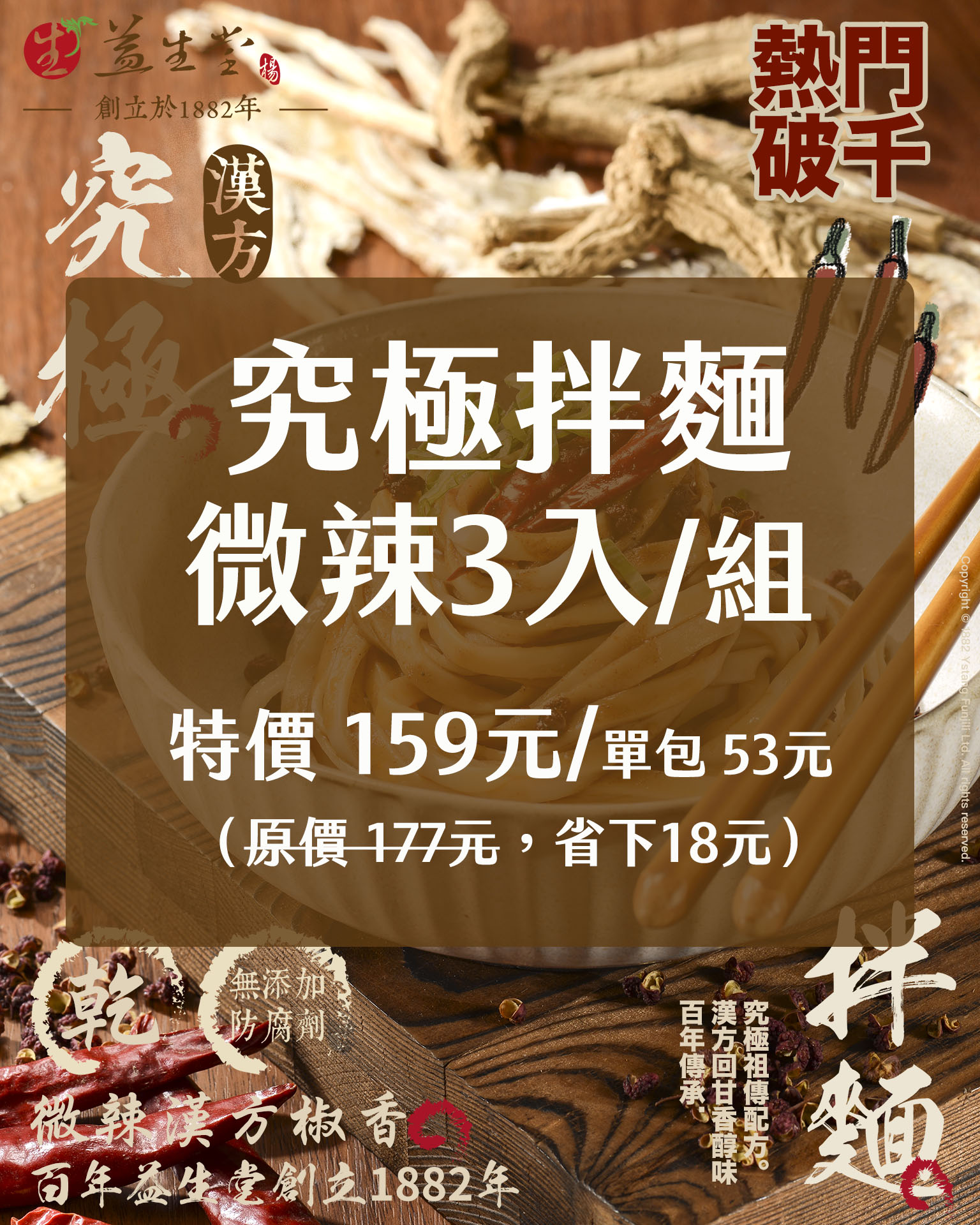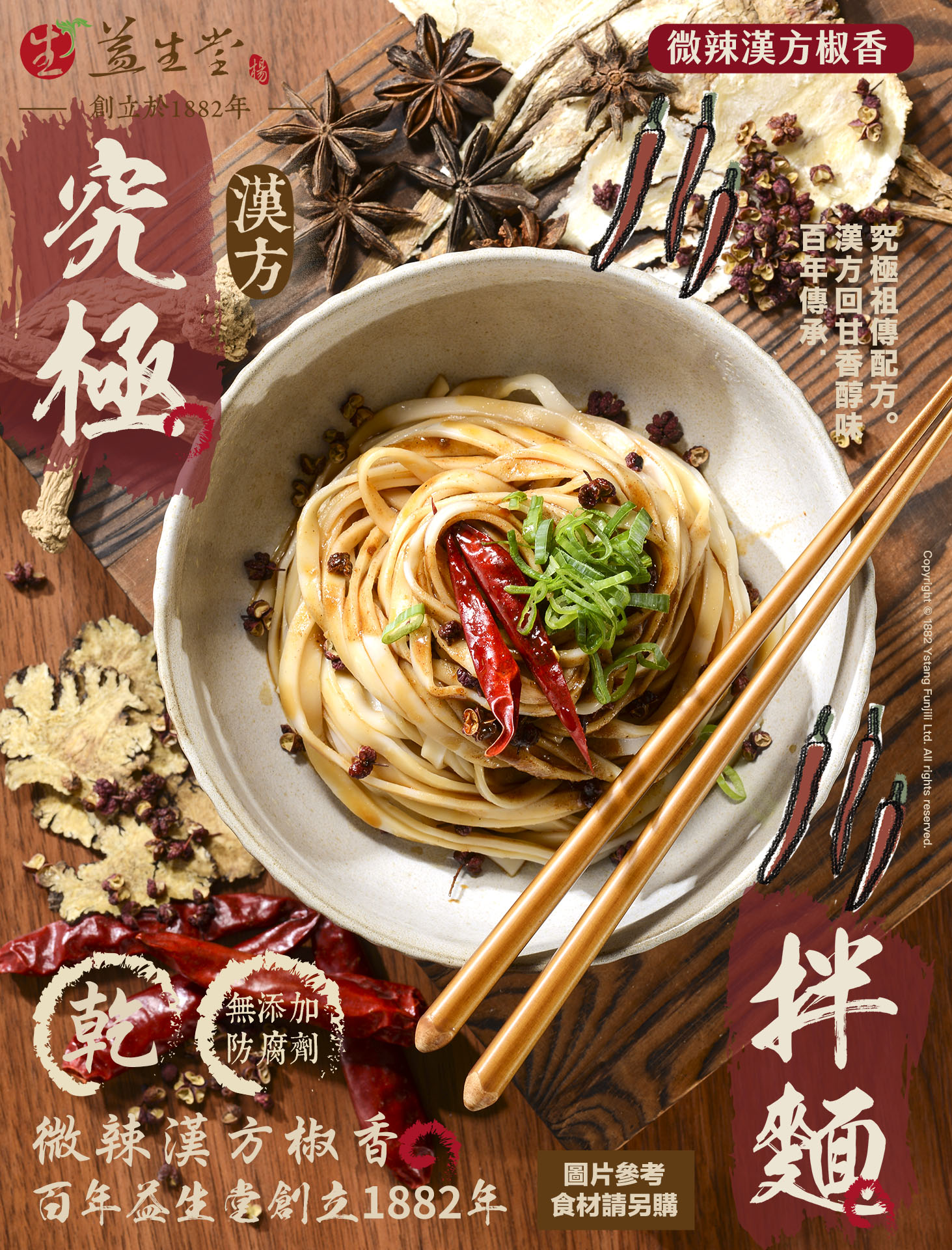 【2025 熱門破千包】益生堂究極拌麵(乾)【微辣漢方椒香】熱門破千包!微辣椒香頂級拌麵.微辣漢方13種食材,百年傳承 9分鐘快速煮食,臺南關廟麵滿足Q口,益生堂月銷破800包,漢方椒香回味無窮!