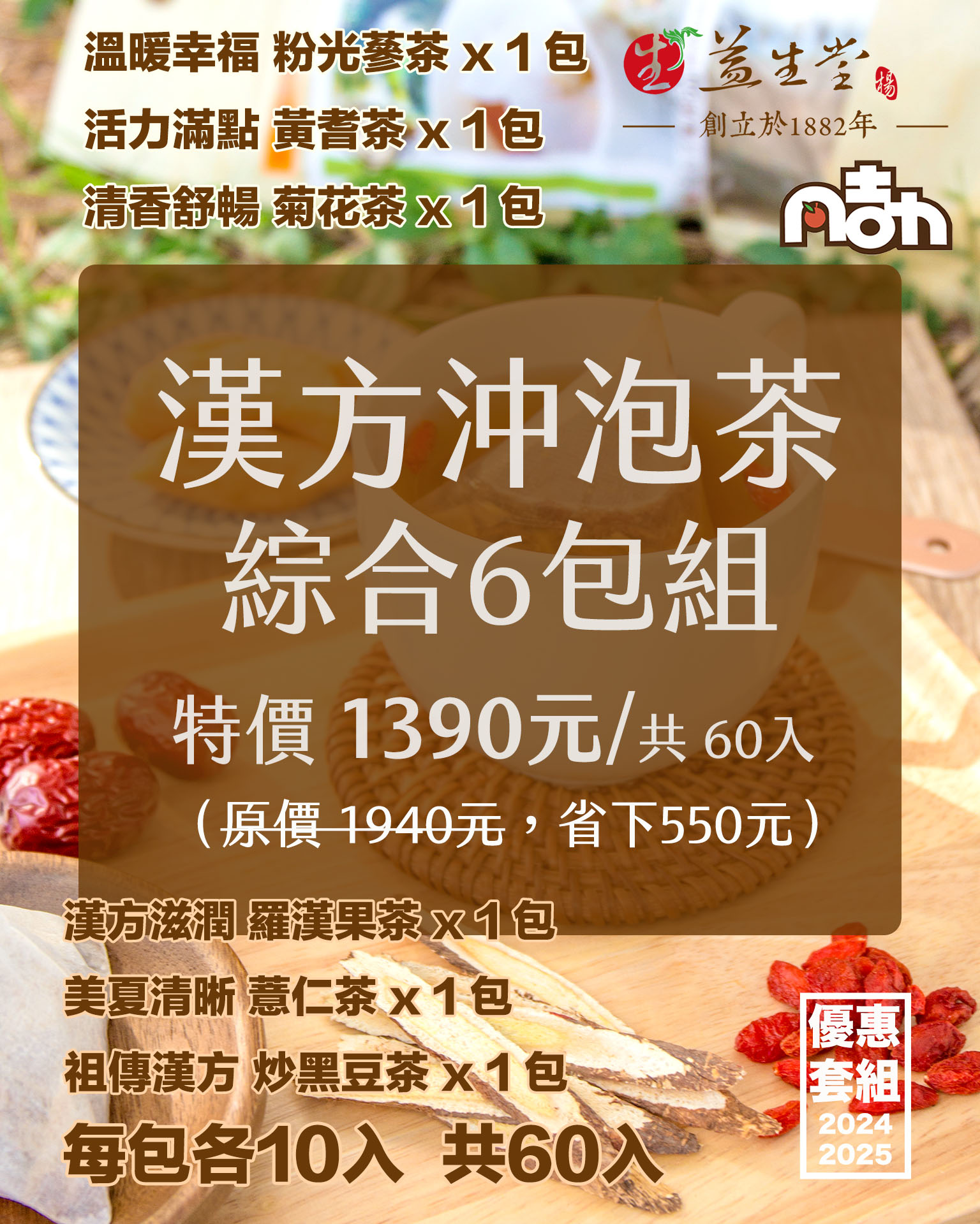 【2026 綜合茶飲6包組】益生堂漢方沖泡茶飲 綜合6包組【共60入】(原價1940元) 1390元/6包組,省下超多550元【漢方粉光蔘茶+黃耆茶+菊花茶+黑豆茶+薏仁茶+羅漢果茶各10入】