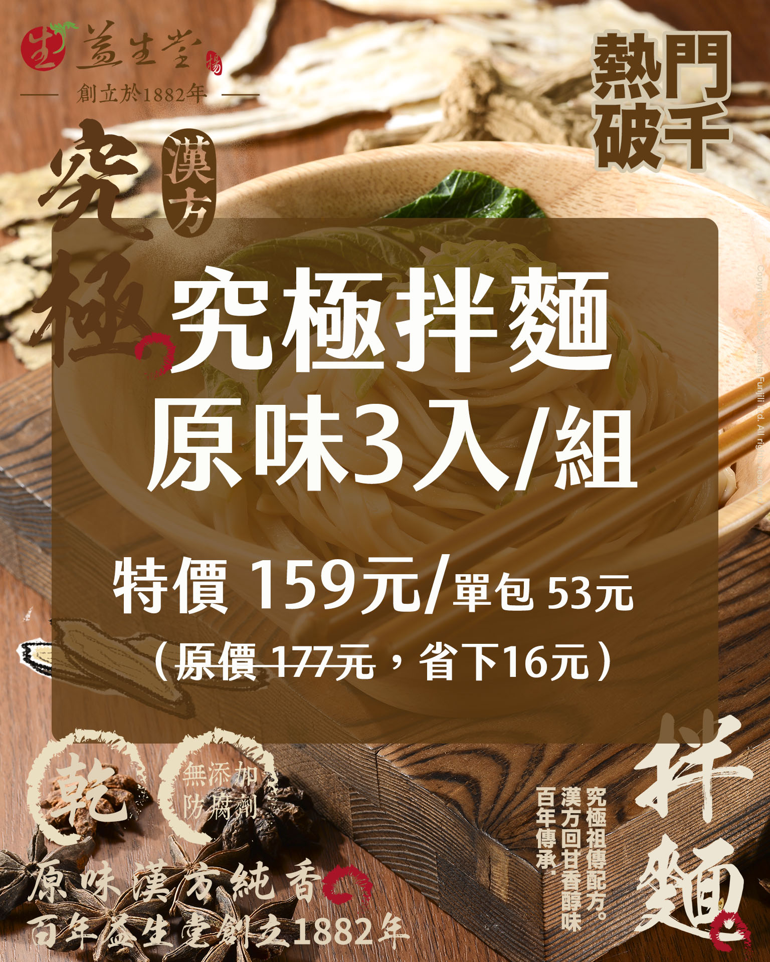 【2025 拌麵套組】益生堂究極拌麵(乾)【原味漢方純香】3入/組 (原價165元) 159元/ 3入組 ( 單包 53元 | 省下超多16元),益生堂月銷破600包,一吃就愛上滿足!