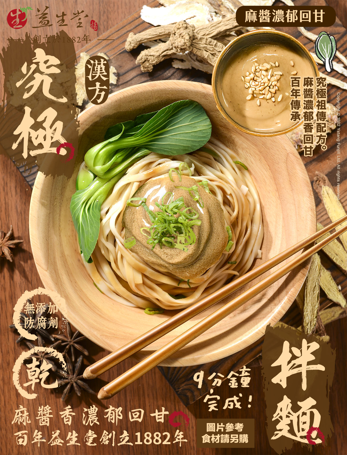 【2025 全新麻醬拌麵】益生堂究極拌麵(乾)【麻醬濃郁回甘】詢問率超高!頂級拌麵醬料濃度回甘.原味漢方14種食材,百年傳承 9分鐘快速煮食,臺南關廟麵滿足Q口,益生堂月銷破500包,一吃就愛上滿足!