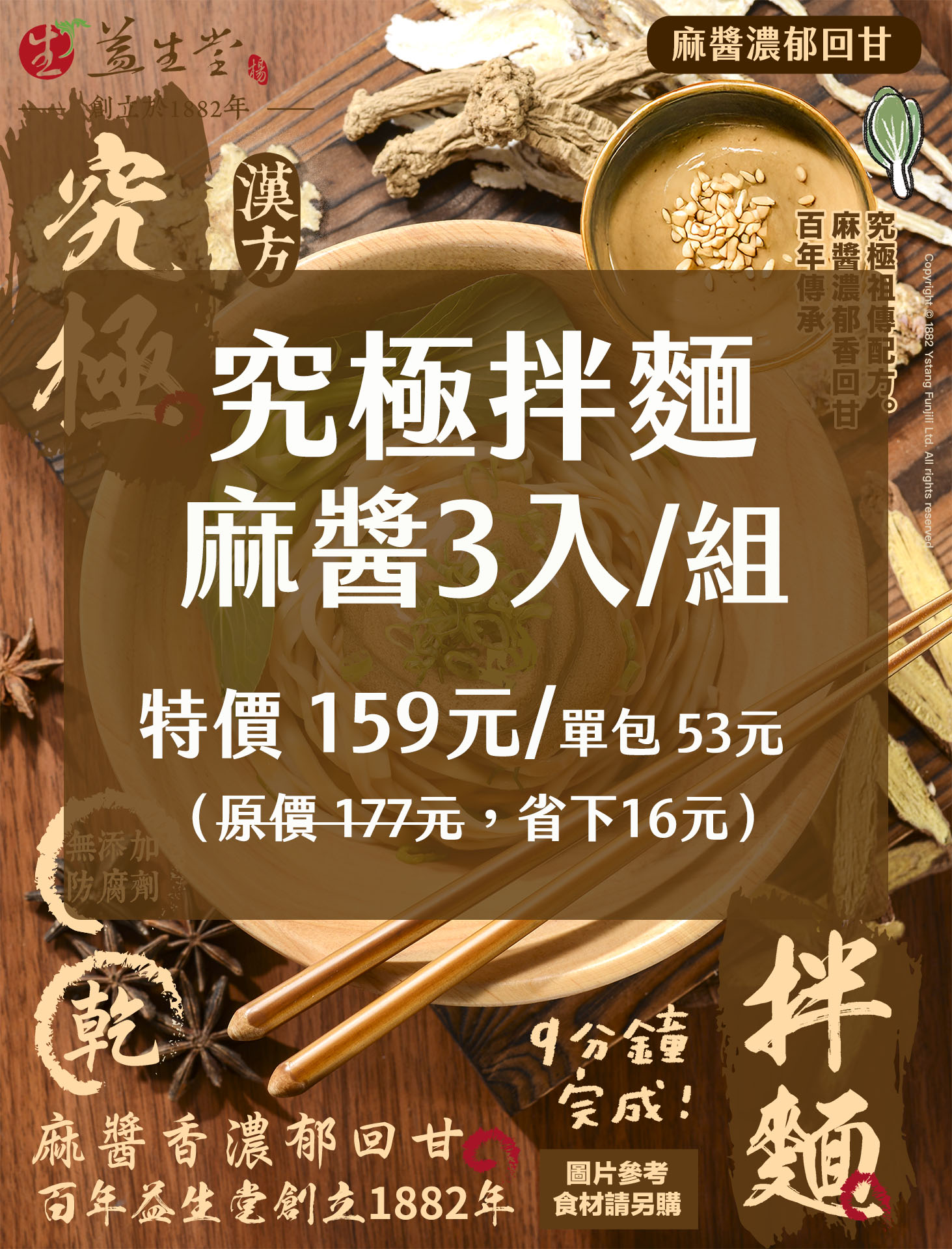 【2025 全新麻醬套組】益生堂究極拌麵(乾)【麻醬濃郁回甘】3入/組 (原價165元) 159元/ 3入組 ( 單包 53元 | 省下超多18元),益生堂月銷破500包,一吃就愛上滿足!