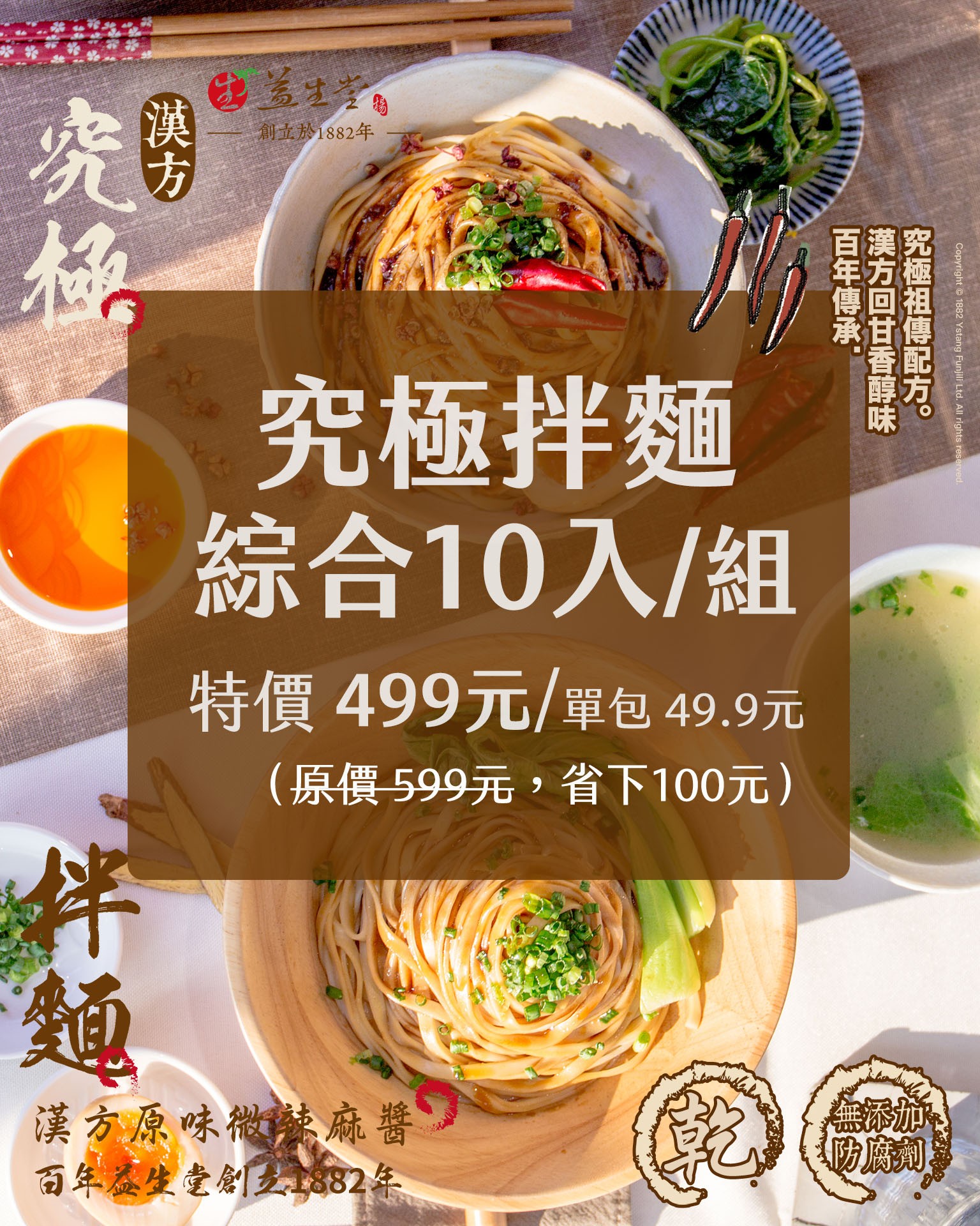 【2026 綜合拌麵套組10入】益生堂究極拌麵(乾)10入/組【原味&微辣各 4 包,麻醬 2 包】(原價570元) 499元/ 10入組 (單包 49.9元 | 省下超多100元)一吃就愛上滿足!